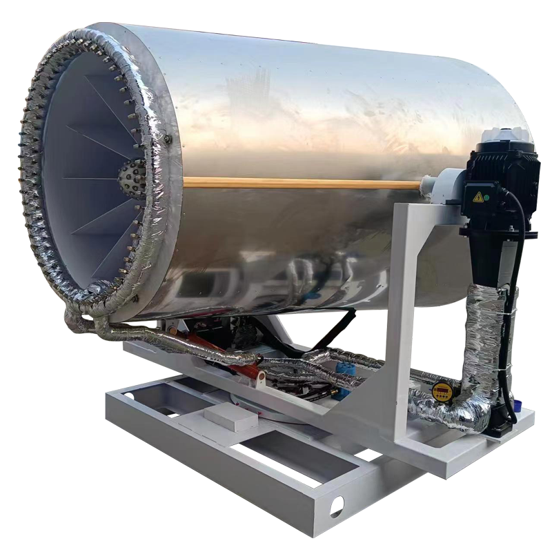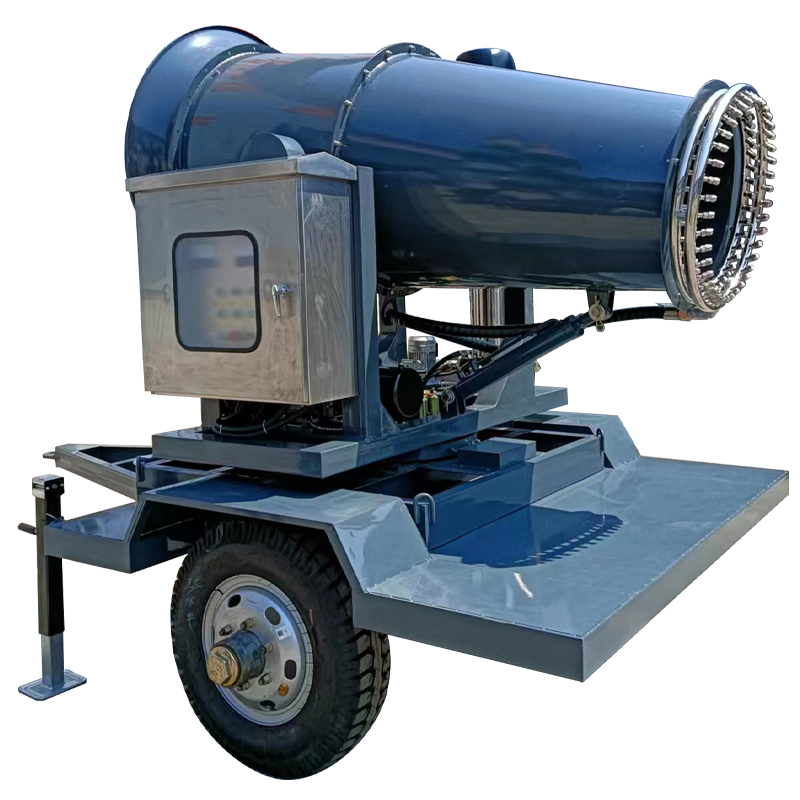 射雾降尘的工作原理是利用高气压将水加压,经过管道输入到高压喷嘴雾化装置形成飘洒在空气中的水雾,水雾经射雾系统将水雾发送到较远距离,水雾能够吸附空气中的细小粉尘和悬浮微粒,在实现降尘的同时给大气加湿。