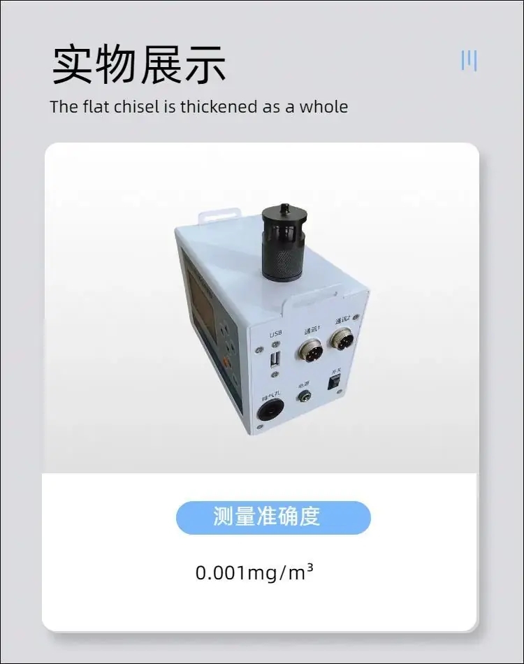 实时显示粉尘质量浓度,量程可至 2000mg/m3,高精确度 0.001 mg/m3,可连续检 测,采样与间隔时间可调;